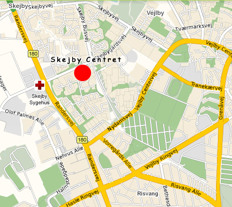 På kortet her er Skejby Centret afmærket med den røde prik.